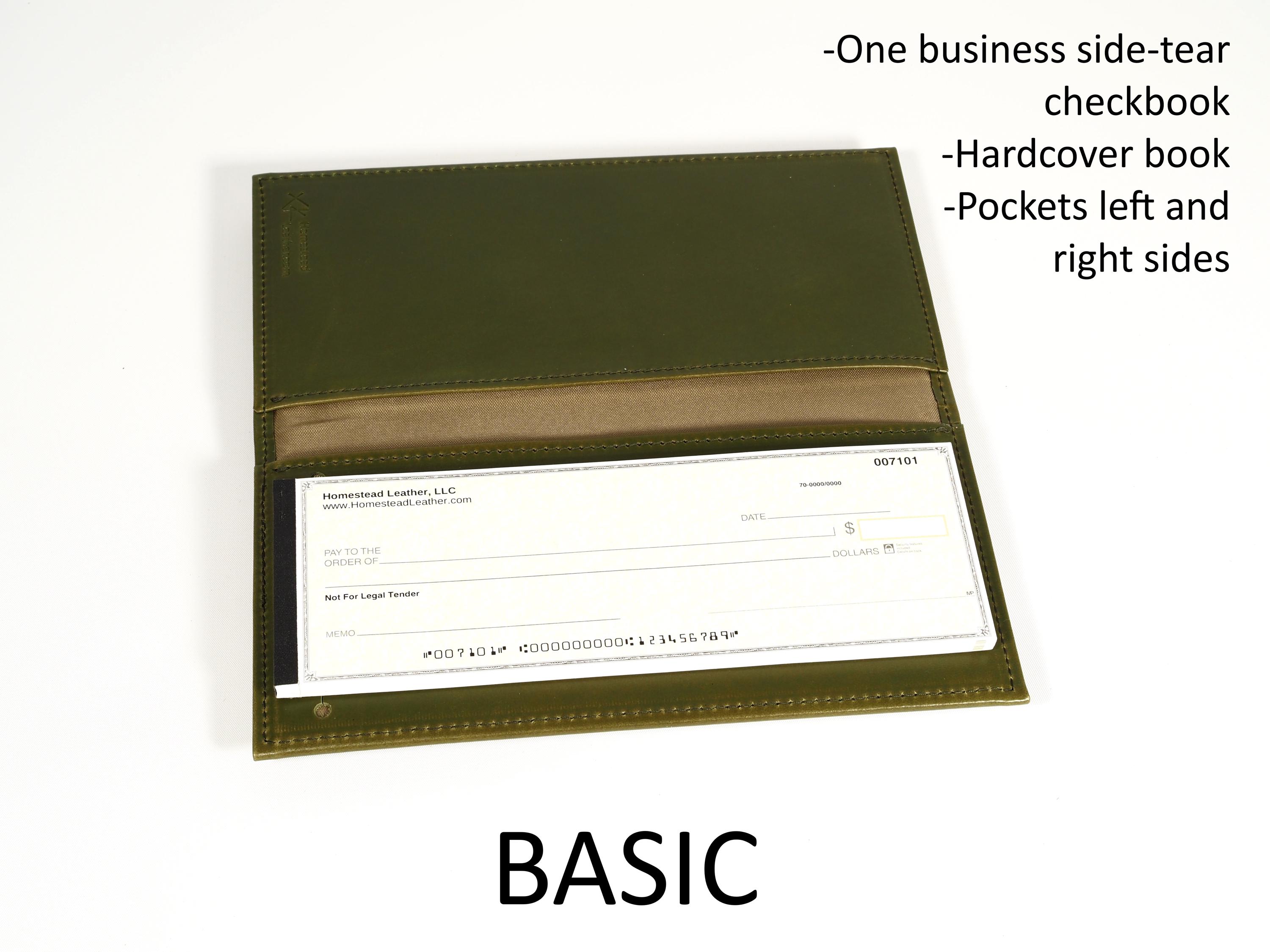 I designed this checkbook for business size side-tear checks. Choose from three styles to suit your needs, whether you want just a cover or you want to carry credit cards and a pen. I choose the best quality leathers available for my products and line the inside for a finished feel. Business sizes are hardcover books. Because I strive to make the best quality products possible, I guarantee my work for life.