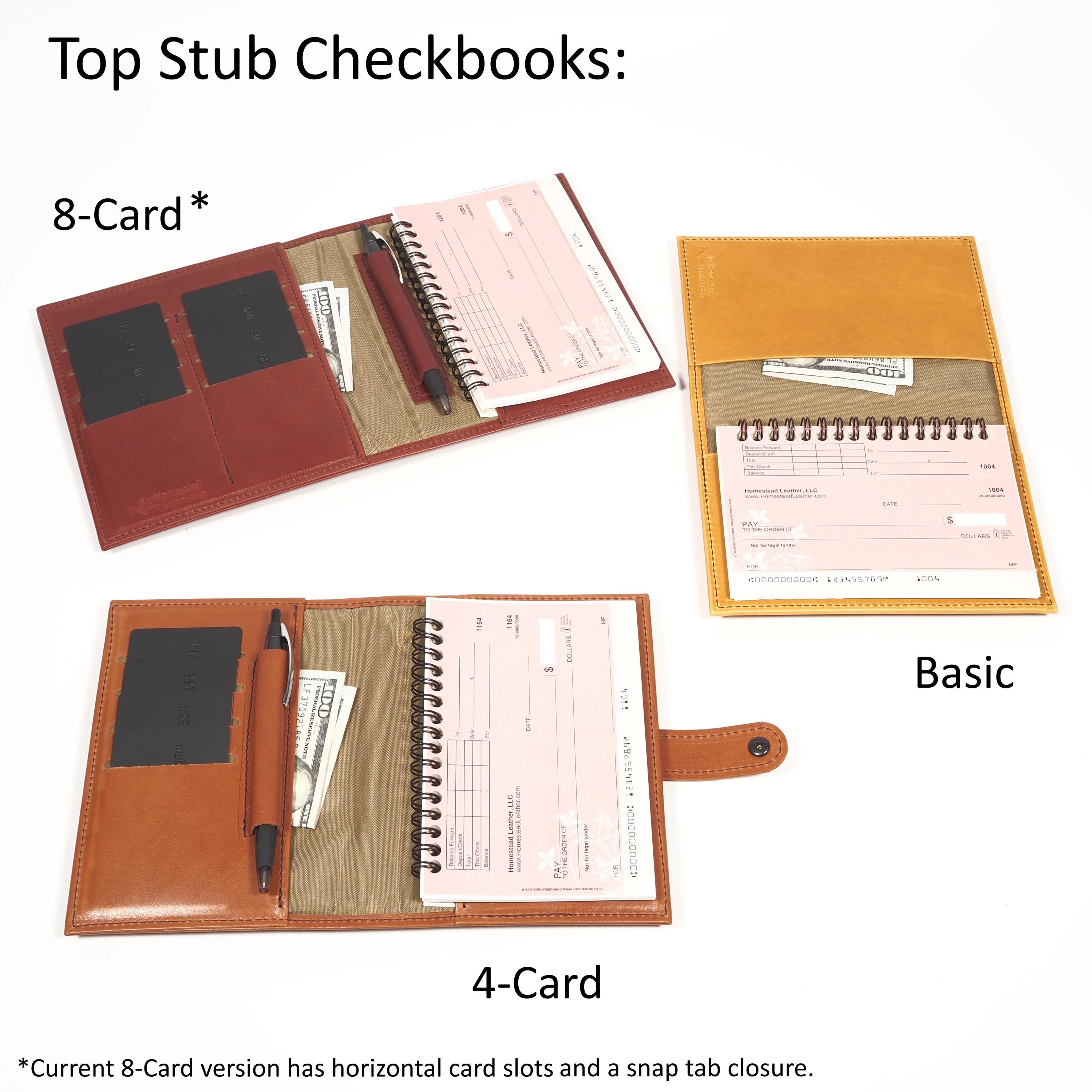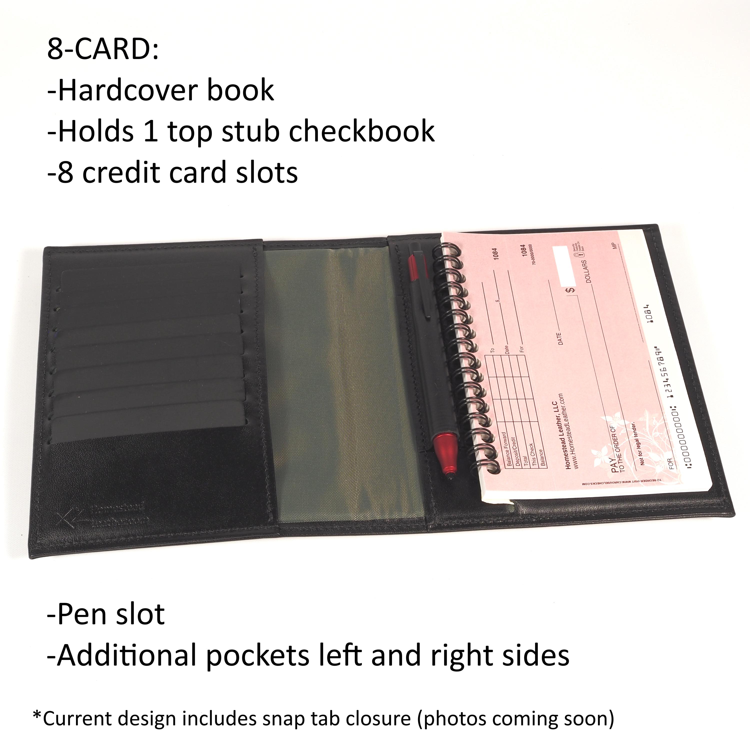 I designed these covers to hold one TOP STUB, or Top Register, checkbook. I currently have three designs to choose from, all of which are hardcover books. Chose my Basic checkbook for a minimal streamlined design, my 4-Card version to serve as a great everyday carry or my 8-Card version for maximum storage. I use the best quality leathers available for my products and line the inside for a finished feel. Because I strive to make the best quality products possible, I guarantee my work for life.