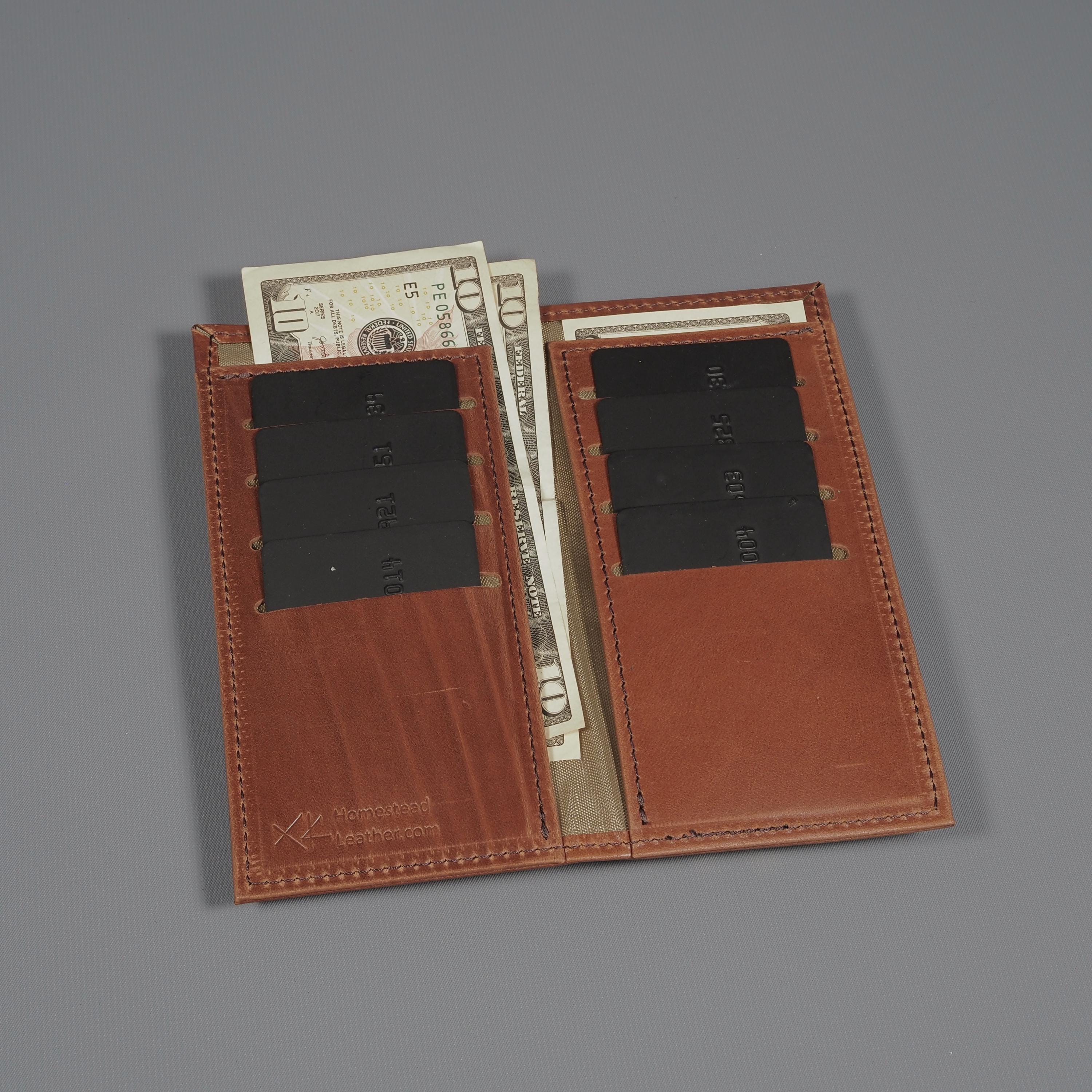 I designed my Long Bifold Wallet with 2 cash pockets and 8 card slots to keep you organized. Bills lay flat, and cards stay within easy reach. Because I strive to make the best quality products possible, I guarantee my work for life.