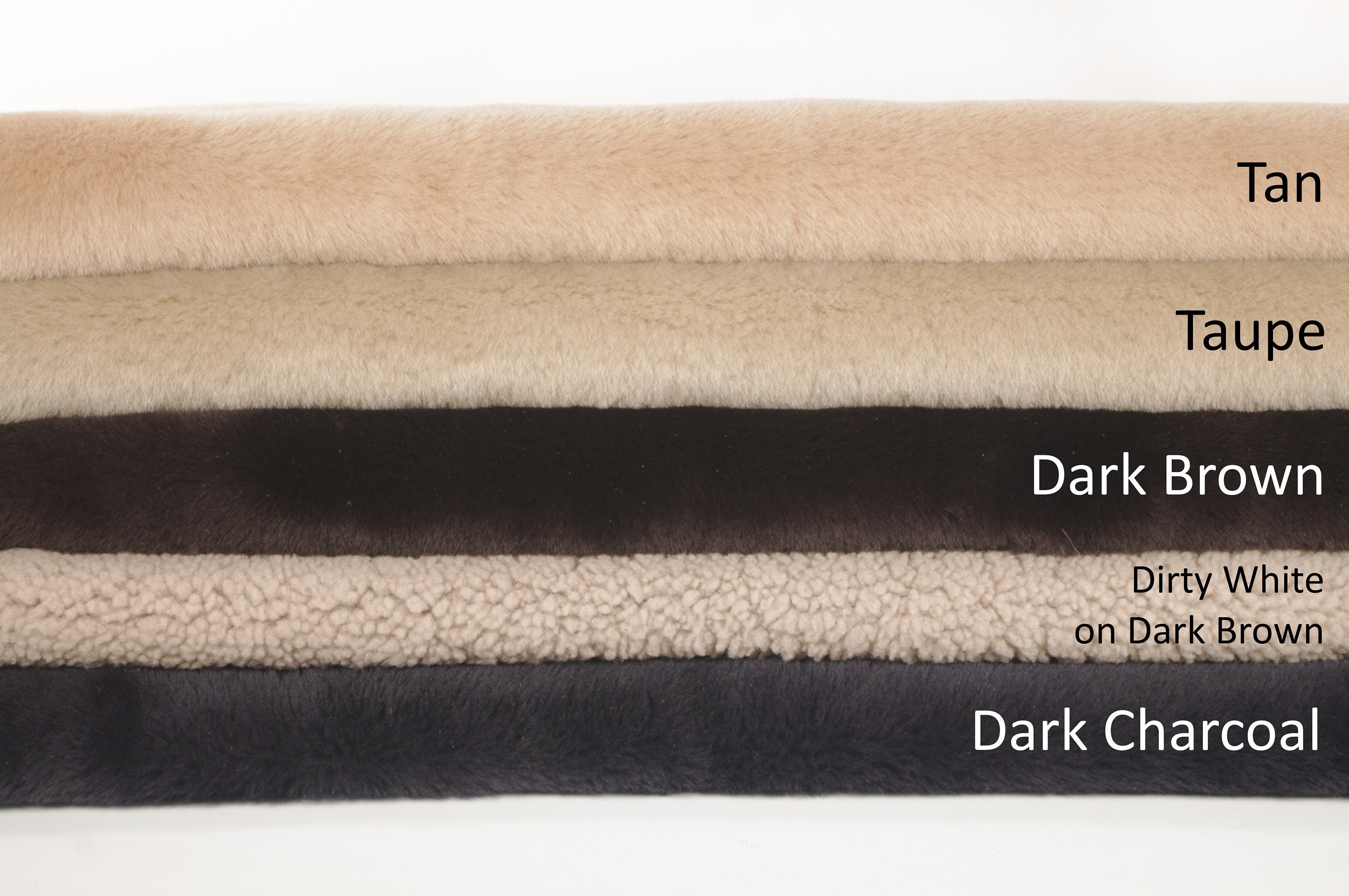 -TAUPE has a color very similar to the Tan, but is more sandy in color. The leather side is suede, and a little lighter than the fur.
